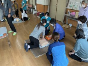 研修では、マネキンを使用した胸骨圧迫の実技や、AED(自動体外式除細動器)の使用方法について、実践的な指導が行われました。