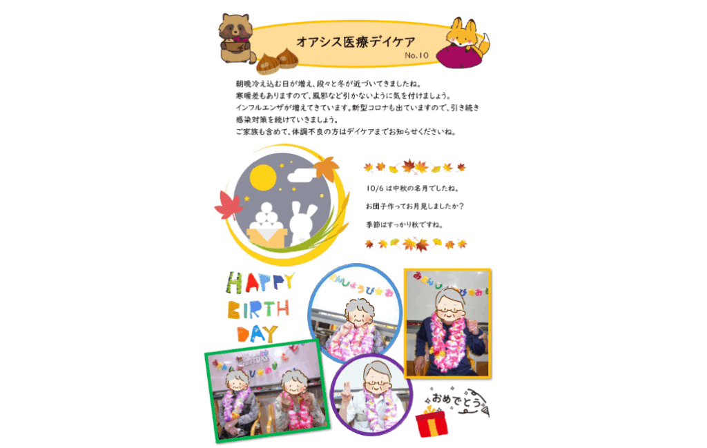オアシス医療デイケア No.10 2025/11/05 お知らせ 朝晩冷え込む日が増え、段々と冬が近づいてきましたね。 寒暖差もありますので、風邪などひかないように気を付けましょう。 インフルエンザが増えてきています。新型コロナも出てきていますので 引き続き感染対策を続けていきましょう。 ご家族も含めて、体調不良の方はデイケアまでお知らせくださいね。