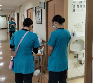 看護師の着用しているユニフォームに袖を通して頂き、朝の申し送りから参加。その後は、看護師と共に、一緒にベッドサイドでのケアを体験。
