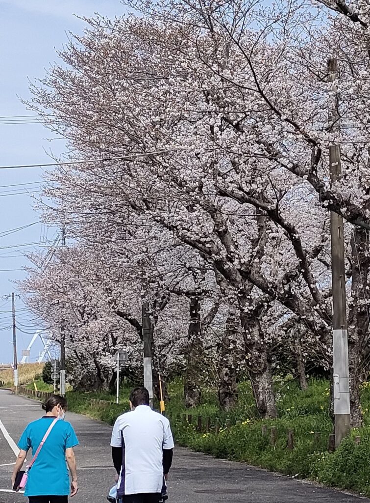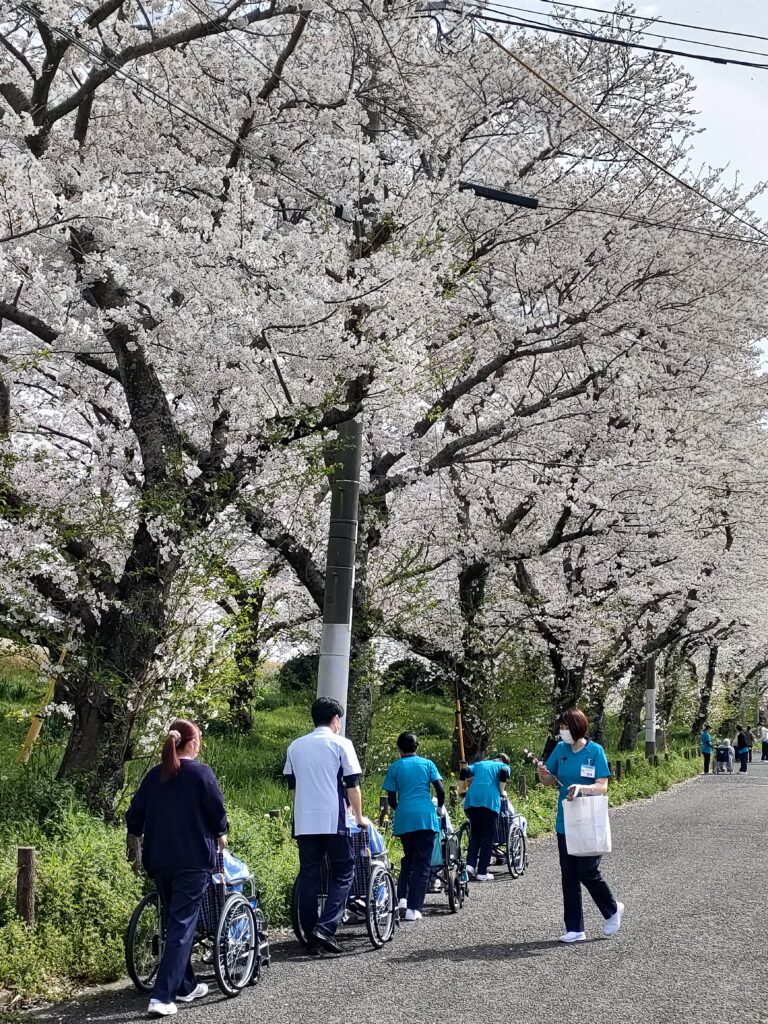 恒例のお花見に行きました 2026/04/11 お知らせ 大野川沿いの桜並木の見えるオアシス病院です。 入院患者様に春を感じて頂きたくて、お花見を恒例にしています。 第一病院、第二病院共に、今年も綺麗な桜の花が咲き誇る中、数日に分け入院患者様と職員総出でお花見に出かけました。 心地よい風が吹く中、満開となった木の下で心温まる時間を過ごすことができました。